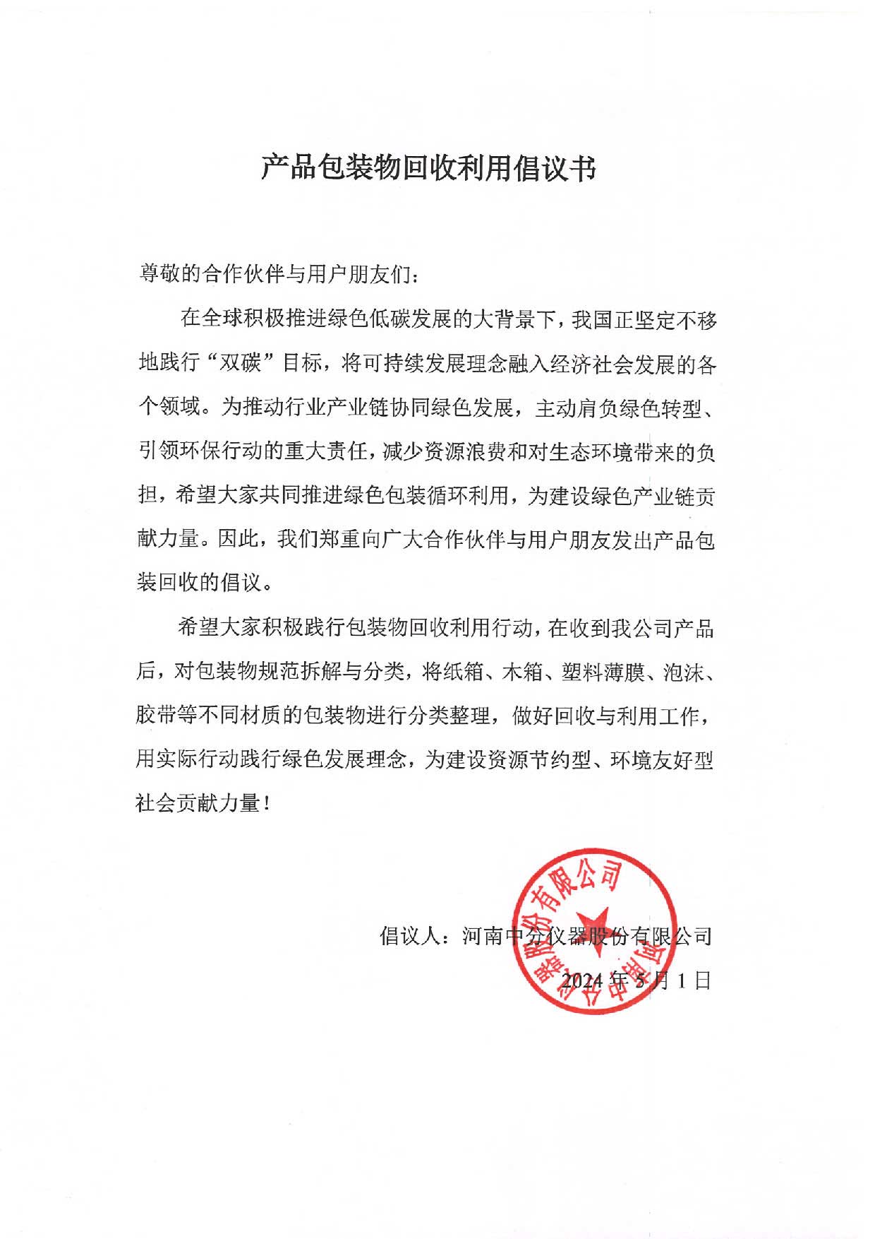 產(chǎn)品包裝物回收利用倡議書